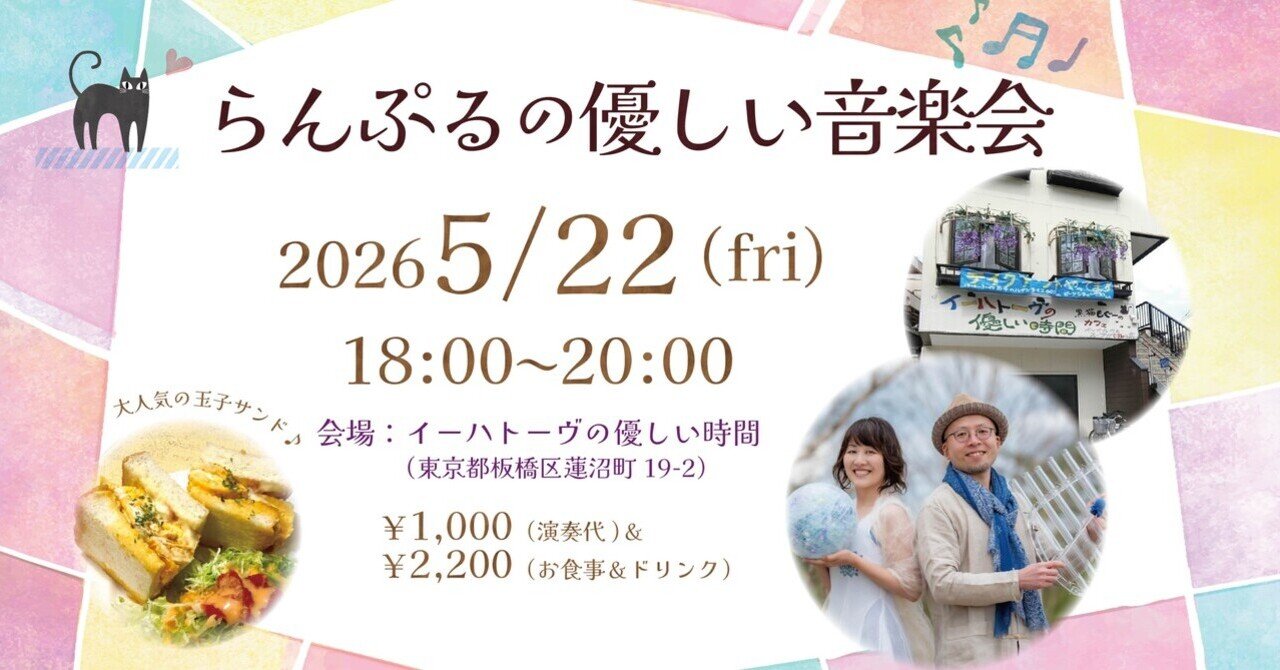 【イベント情報】5/22 らんぷるの優しい音楽会 2026-04-07 最終更新日時 : 2026-04-07 jiyudo 【イベント情報】らんぷるの優しい音楽会|常識からそっと抜け出す | シェアnote こんにちは! 自由道家の宮下です🐼 今回もイベント情報解禁です! 【日時】 5月22日(金)18:00〜20:00 【会場】 イーハトーヴの優しい時間 東京都板橋区蓮沼町19-… note(ノート)